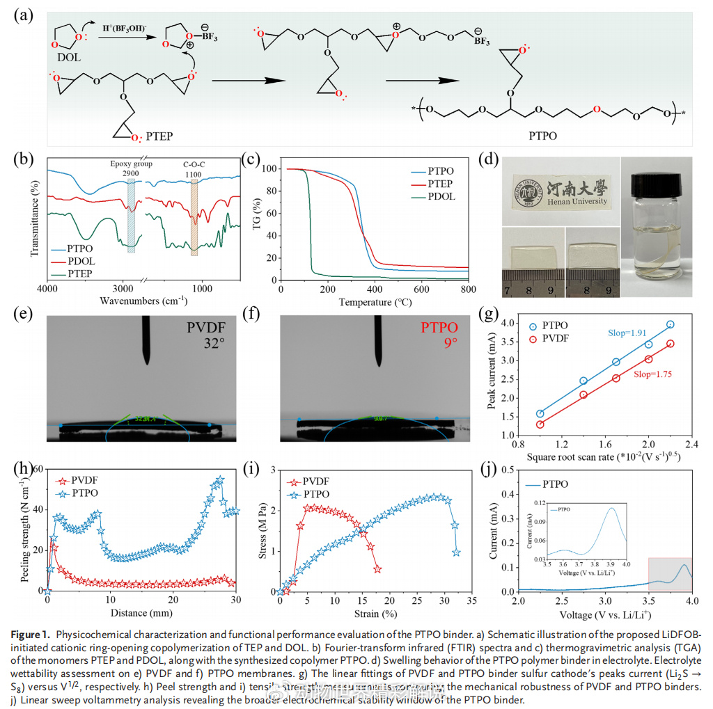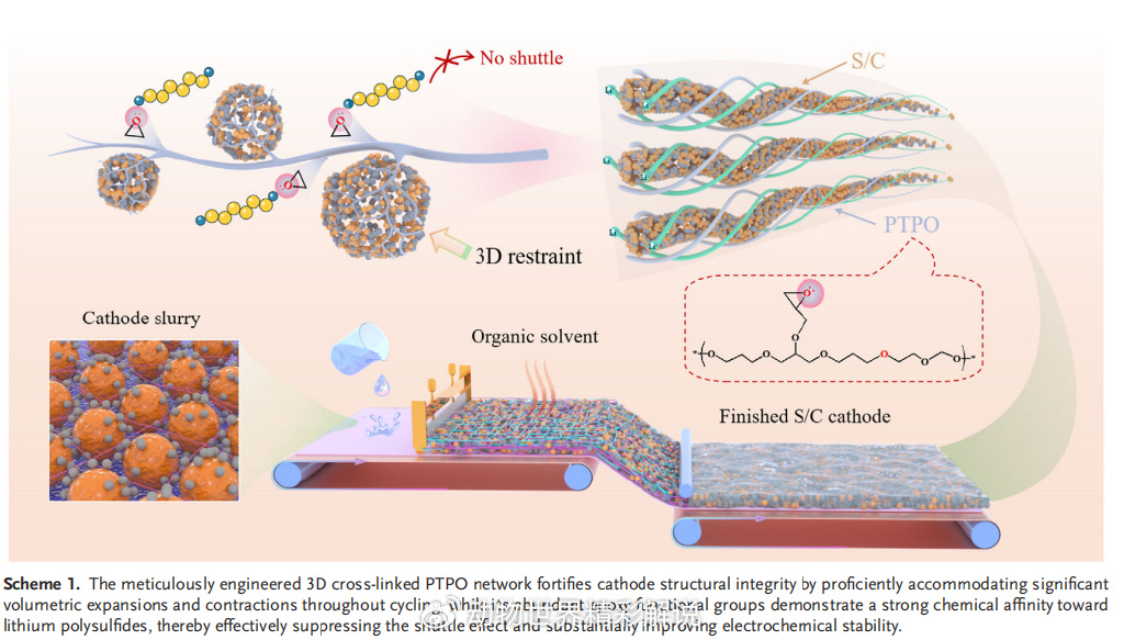 传统PVDF或PAA粘结剂在高硫电极中通常只起到“物理支撑”作用,无法有效抑制多硫化物扩散。而研究团队设计的PTPO(poly(thiol-epoxy ether) network)采用三维交联结构,由**甘油三缩水甘油醚(TEP)与1,3-二氧戊环(DOL)**通过阳离子开环共聚合得到。