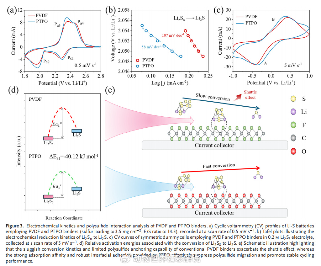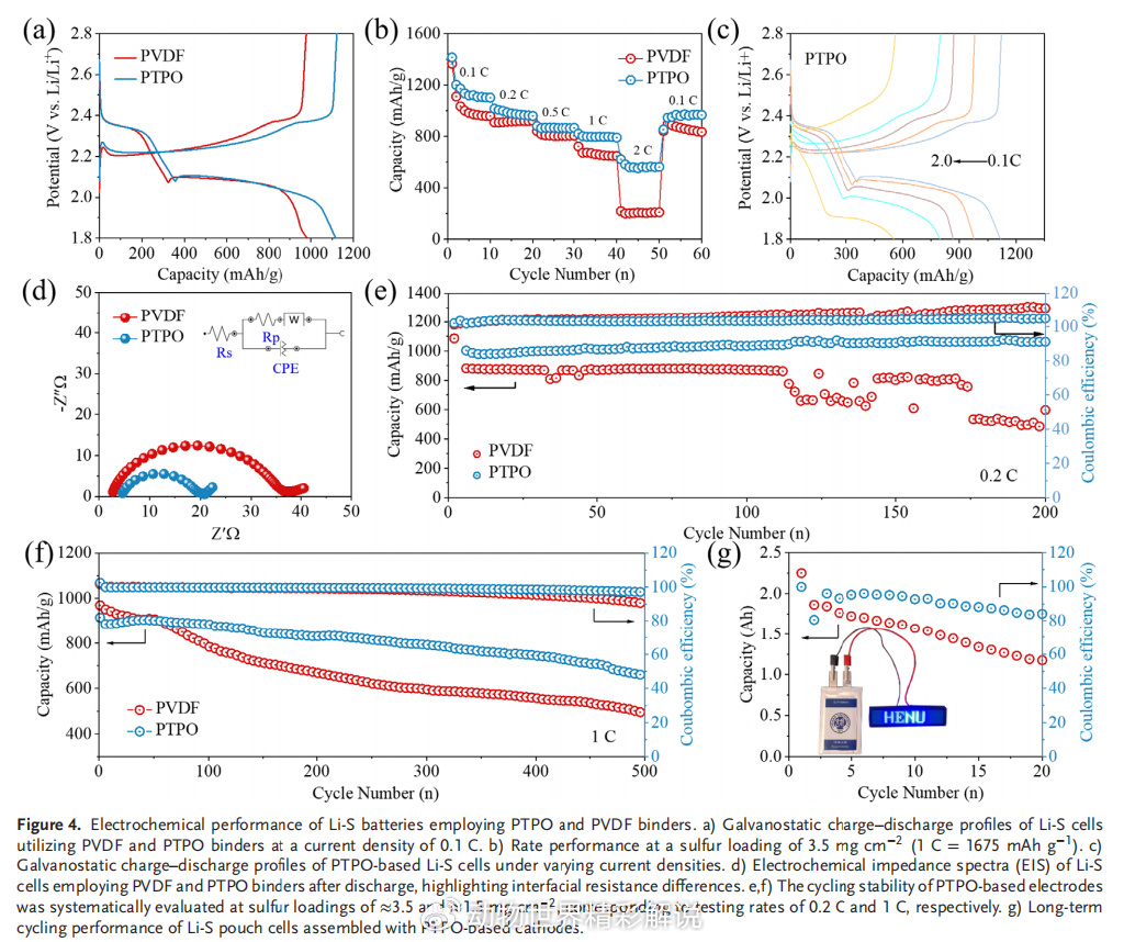 此外,电化学阻抗谱(EIS)表明,PTPO能够降低界面电阻并提升锂离子传输速率,从而加速硫的氧化还原动力学过程。